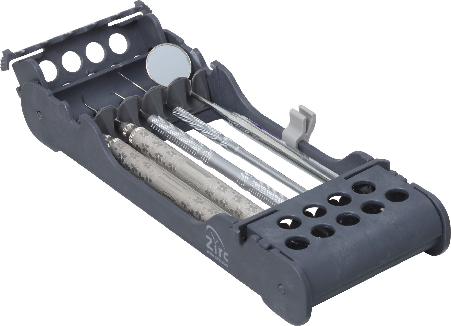 5本のインスツルメントを収納できる、滅菌、輸送用のケースです。一体型ロック式カバーで、開閉が簡単です。汚れやすいハンドル部を覆わない形状で、効率よく滅菌が出来ます。