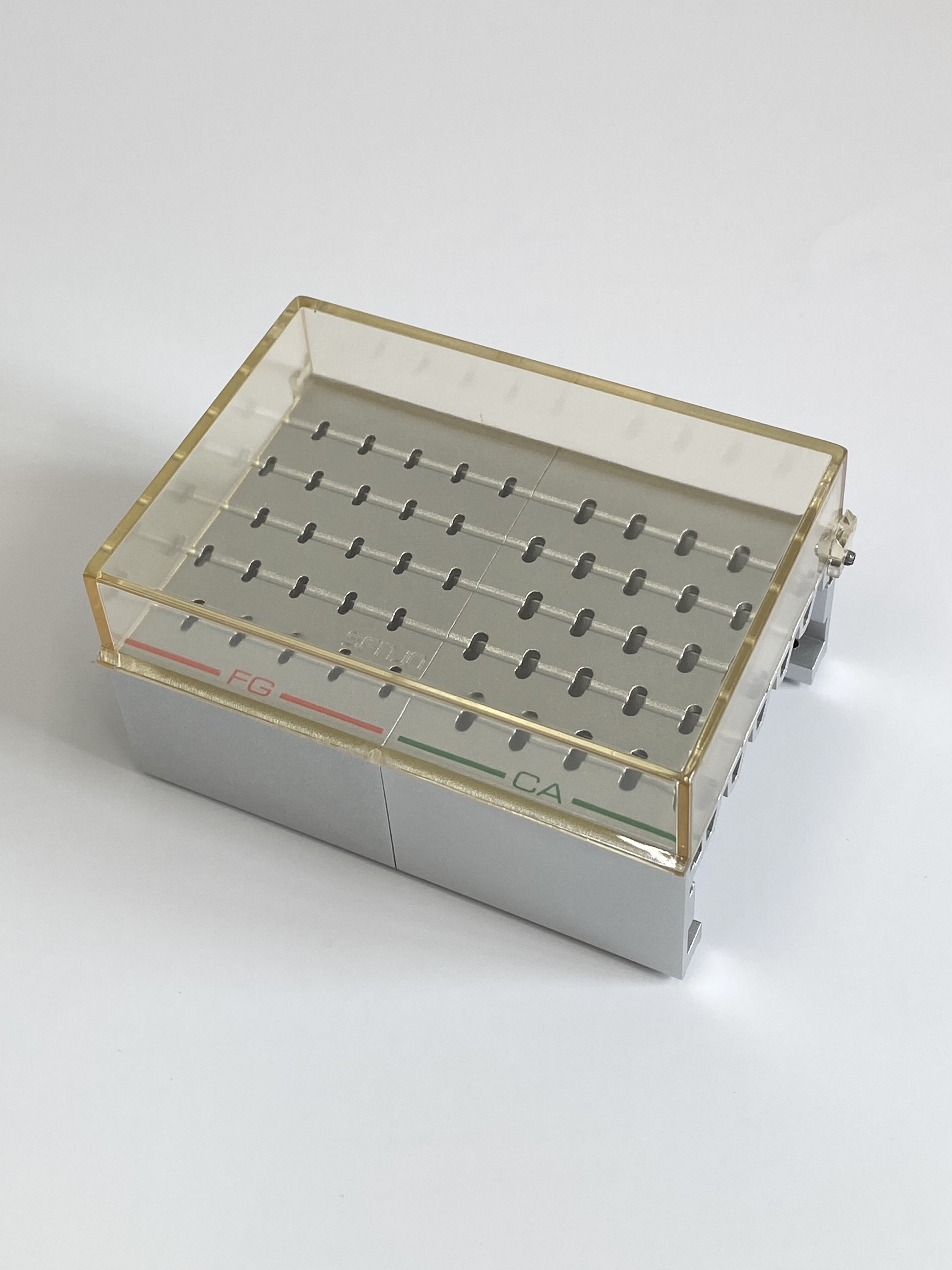 バーホールが長円のため、バーの軸がどの方向からセットされてもバーは常に同方向に傾斜し、出し入れが簡単です。FG、CAバーをセットしたままで薬液消毒、オートクレーブ滅菌が可能です。ビックポイント・ピーソリーマーCA等が収納できる14mm深い蓋(カバーD)もあります。