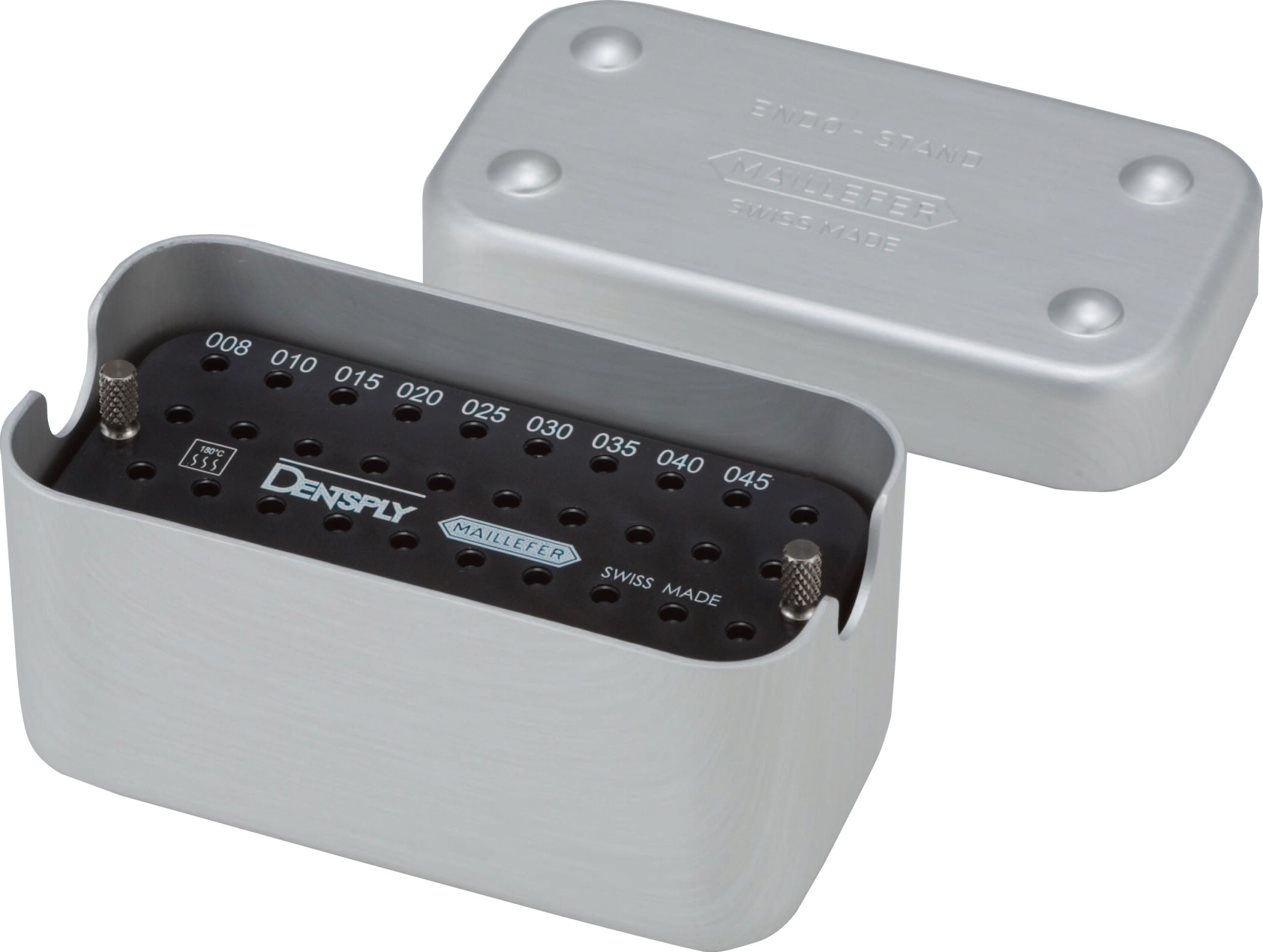 リーマー・ファイル用のスタンド。ケースはメタル製ですが、中身はプラスチック製で一体成形のため、超音波洗浄に適しています。また、中身はオートクレーブが可能です。