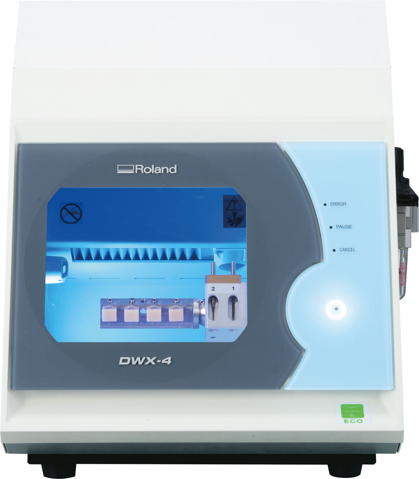場所を選ばないコンパクト設計。「 カタナアベンシアブロック」を4本装着可能です。装着には別売のDWX-4ピンタイプジグが必要です。小型ながら4軸加工機能や自動工具交換機能(ATC)が標準装備されておりカタナミリングバーを2本まで装着可能です。
