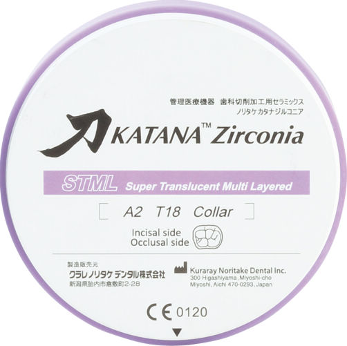 色調の異なるジルコニアを積層したマルチレイヤージルコニアで、カタナジルコニアシリーズの中で最も透光性を有するシリーズです。透明感の必要な前歯クラウンやラミネートべニアの製作に適しています。全ラインナップはシェード14色、厚み3種となります。※画像は、ノリタケカタナジルコニアUTML、STML、MLのものです。