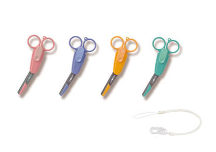 刃先がまるく、プラスチックカバー付のポケットサイズ雑用ハサミです。包帯をカットする時も刃が直接肌に触れず、フッ素樹脂加工なので粘着テープを切っても刃にテープの粘りがつきにくくなっています。