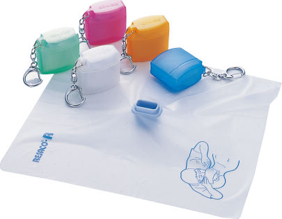 「マウス・ツー・マウス人工呼吸」時に用いる一方向弁付呼気吹き込み用具で、人工呼吸時のB型肝炎・エイズ等の感染対策に有効です。呼気や口臭が逆流しない一方向弁(逆止弁)付マウスピースとフェイスカバーで、傷病者に直接触れることなく人工呼吸を施すことができます。