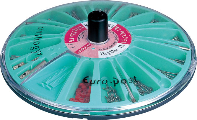 ユーロポストは築造体の強度や保持力の増加をはかることを目的としたソフトリテンションタイプのスクリューポストです。厳選されたステンレス鋼製で、螺旋上の溝が付与され、高い耐蝕性と強度を有しています。アソートキットにはX線写真に合わせ、適切なポストを選択するためのポスト長ガイドフィルムがついています。「ねじ込み」を行わずセメント等により根管内へ固定するポストです。