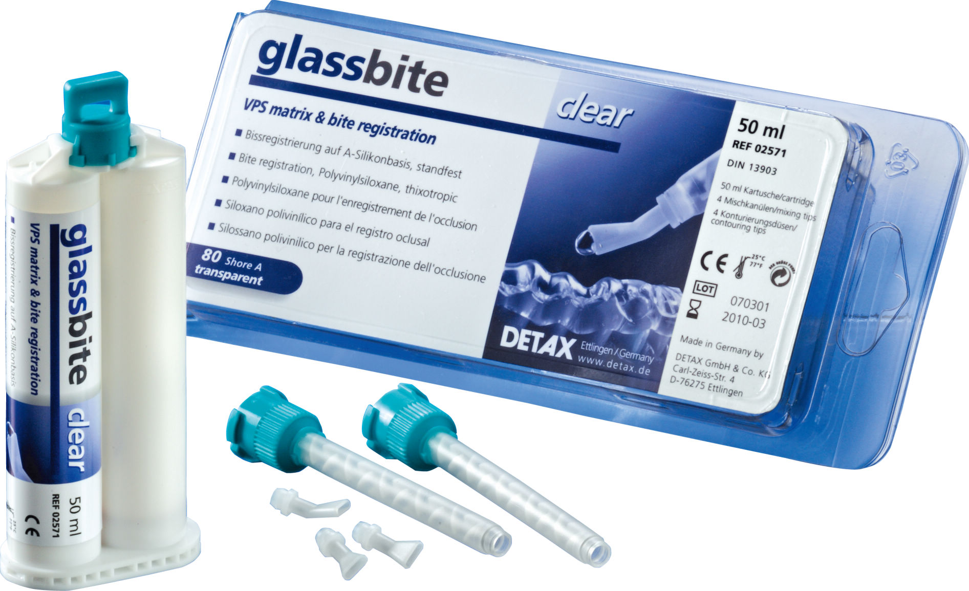 透明シリコーン系バイト材で、作業時間30秒、口腔内保持時間60秒で硬化。硬化時にはシェアA硬度80の硬さがあり、たわみ、浮き上がりを防ぎます。透明タイプですので、光重合型レジンのコアとしても使用出来ます。コントロールチップを使用することで常に均一な薄さと適度な幅で必要量だけの注入が行えます。