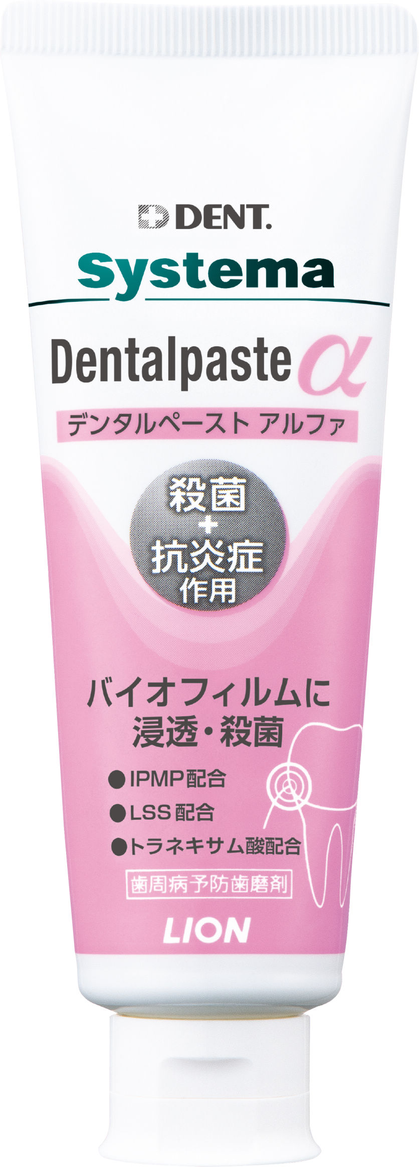 バイオフィルム内部まで浸透、殺菌するIPMP(イソプロピルメチルフェノール)、歯肉の炎症、出血を抑えるトラネキサム酸、原因菌を殺菌し、口臭を予防するLSS(ラウロイルサルコシンナトリウム)の3つの薬用成分が歯周病、口臭を予防します。