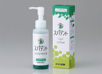 蜂蜜(プロポリス)とお茶(フラボノイド)の天然成分を使用した安全性の高い義歯洗浄液です。レジン床や金属床の材質を傷めることなく、チタンや銀ロウにも使用可能で、優れた脱臭効果、口腔内雑菌に対する除菌効果を有しています。