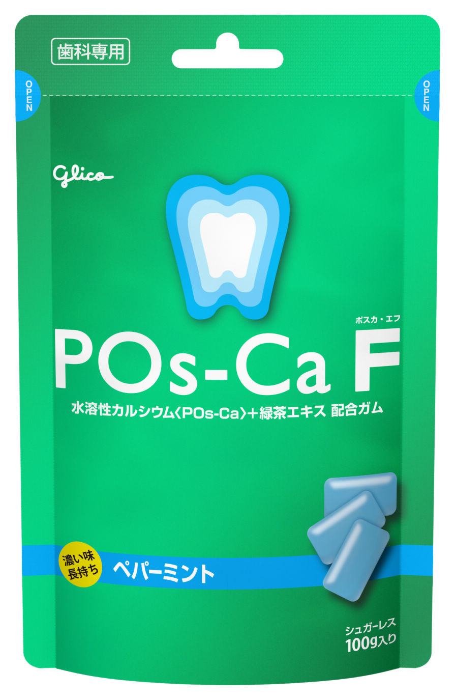ご愛顧頂いていましたポスカムをリニューアルしました。従来より配合の水溶性カルシウム《POs-Ca(ポスカ)成分》に加え、《緑茶エキス(フッ素含有)》を新配合しました。共に高い水溶性を有していますので、ガムを噛むことでだ液中のカルシウムイオンとフッ化物イオンを同時に高めることができます。又、味持ちも改良することで、長い間噛むことができ、だ液もたくさん出るようになりました。(従来品比較)