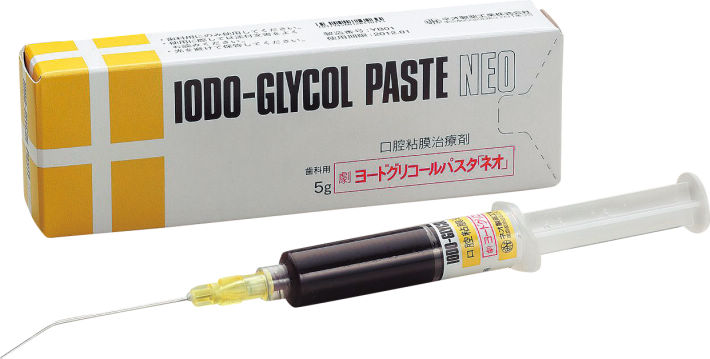 5%のヨウ素を含有したパスタ状の製剤です。専用のシリンジに封入されているので貼薬操作が容易であり、局所滞留性にとみ、刺激が少なく液剤にくらべて、苦味がないのが特長です。