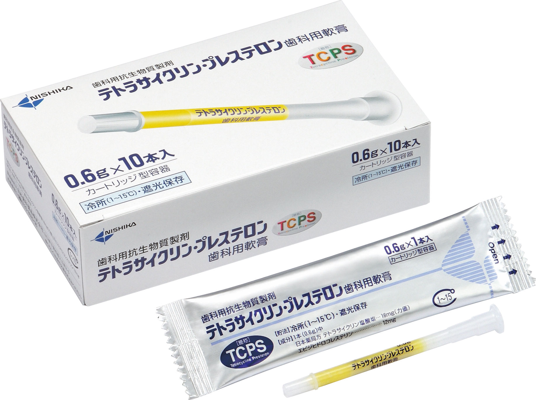 抗生剤のテトラサイクリンと抗炎症材のプレステロンを配合した歯周炎治療薬です。適応症は歯周組織炎、抜歯創・口腔手術創の二次感染、感染性口内炎であり、幅広くお使いいただけます。製品形態も2種類あり、院内処置に使いやすいカートリッジ型と患者さんへの投薬に便利なチューブがあります。