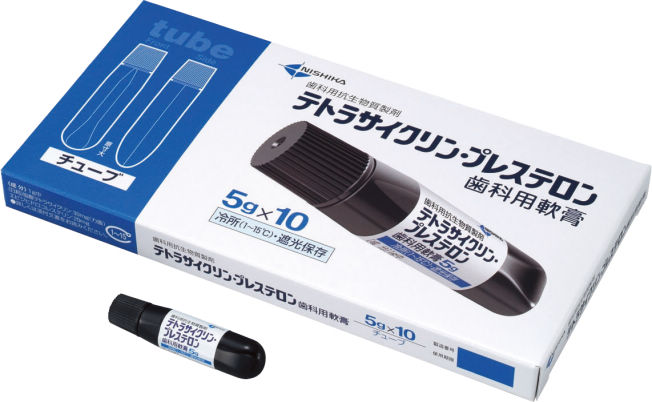 抗生剤のテトラサイクリンと抗炎症材のプレステロンを配合した歯周炎治療薬です。適応症は歯周組織炎、抜歯創・口腔手術創の二次感染、感染性口内炎であり、幅広くお使いいただけます。製品形態も2種類あり、院内処置に使いやすいカートリッジ型と患者さんへの投薬に便利なチューブがあります。