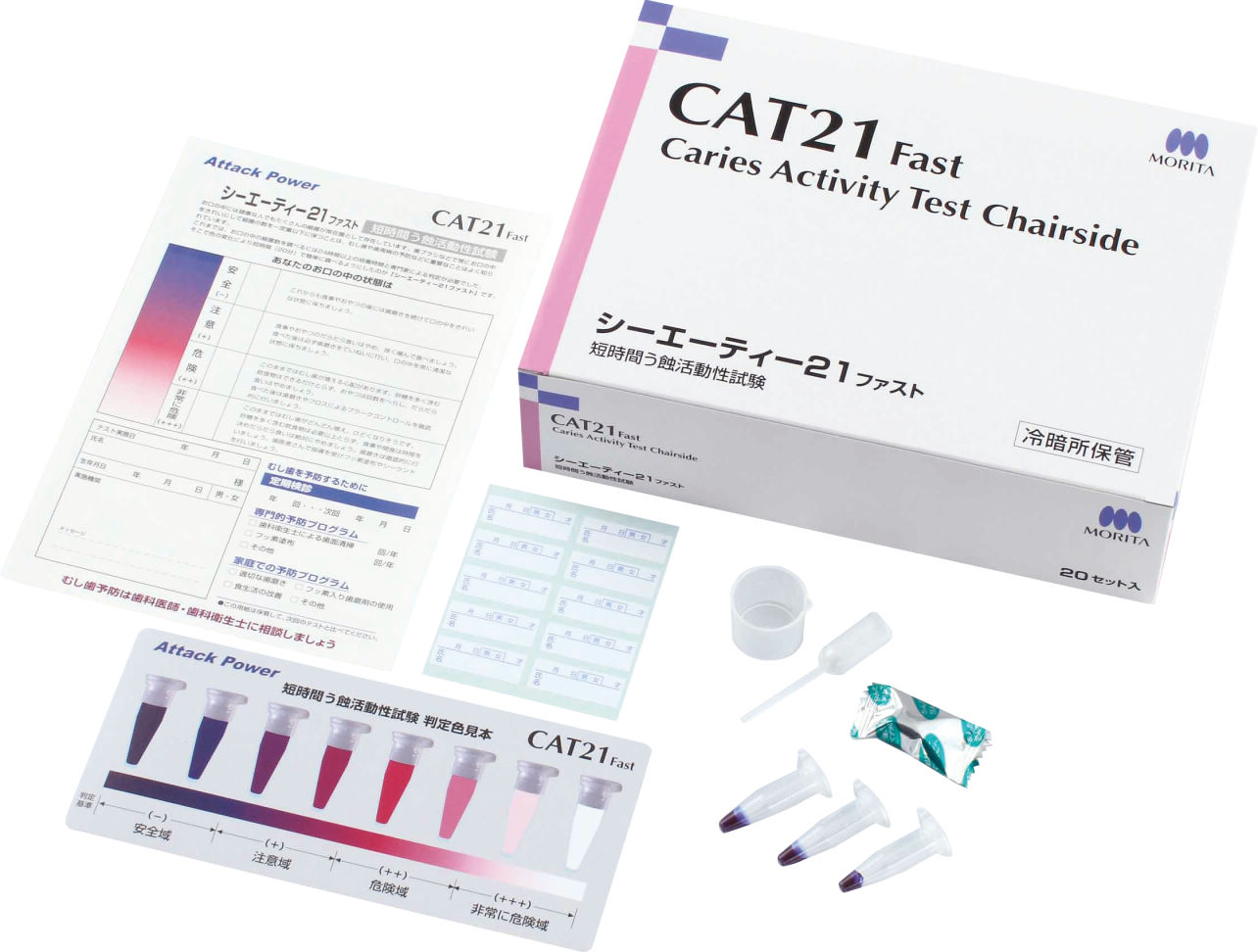 唾液中のう蝕原生菌の活動性によってう蝕になる危険度を調べるう蝕活動性試験で、従来に比べ短時間で判定することができるキットです。無菌操作を必要とせず、操作がきわめて簡単、約20分間の培養で判定が行えます。う蝕原生菌の活動性を容易に色調で判定できます。