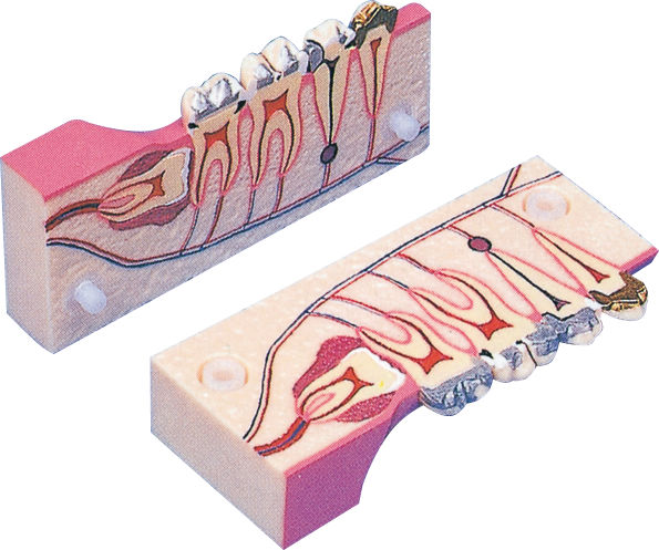 2.5倍顎下顎右8~4部分を垂直に分割したもので、歯根組織、神経線、歯冠インレー、膿瘍、水平埋伏智歯を示し、特にX線撮影の必要性を患者さんへ説明するのに適した模型です。