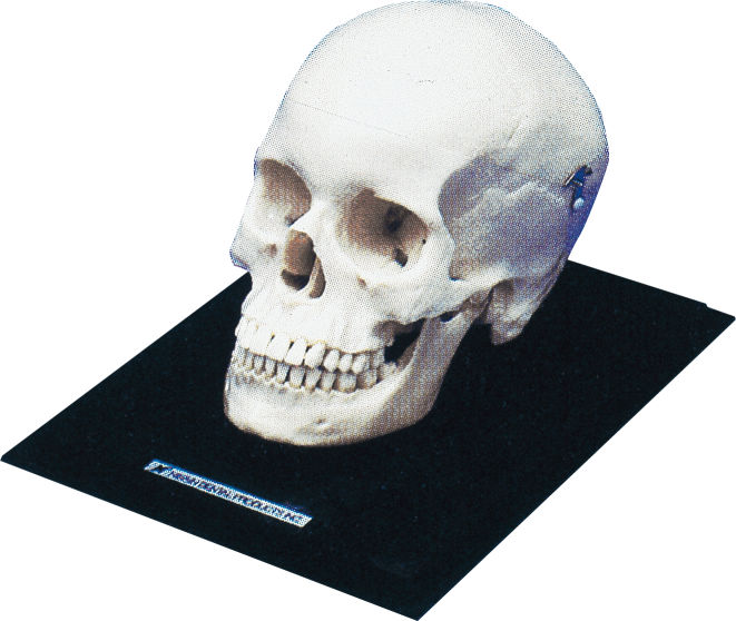 エポキシレジン製の頭蓋骨複製模型で智歯を有し、健全歯は着脱が可能です。また頭骨をはずすことにより頭蓋底の観察も可能です。