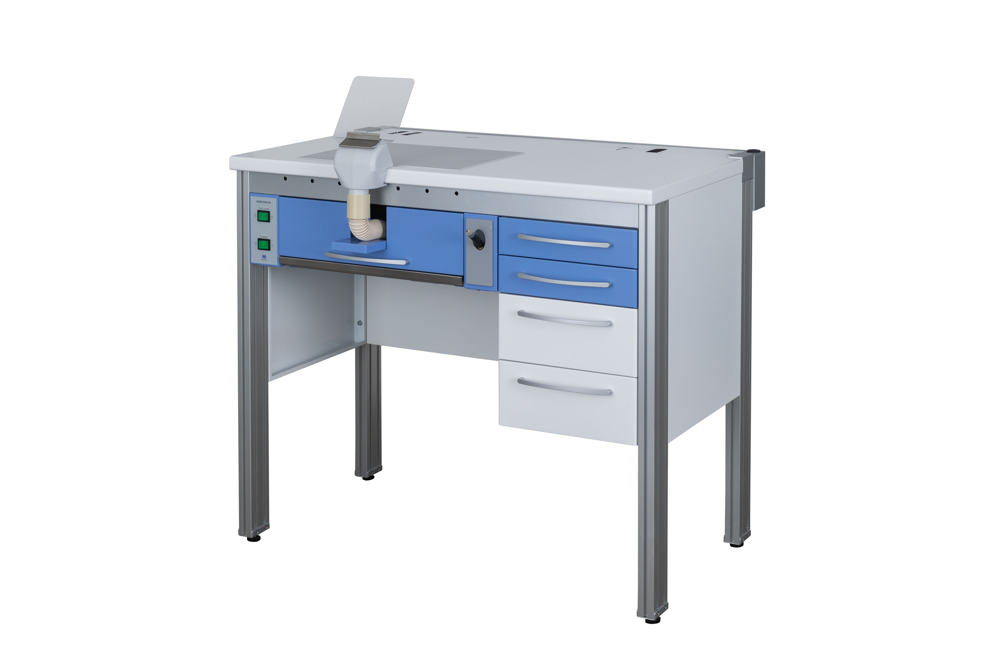 人間工学によりデザインされているため、作業効率を高め、快適空間に導く技工机です。2Wayバキュームマウスは、研磨作業内容に合わせて、吸い込み口を天板上、引き出し中へと移動可能です。