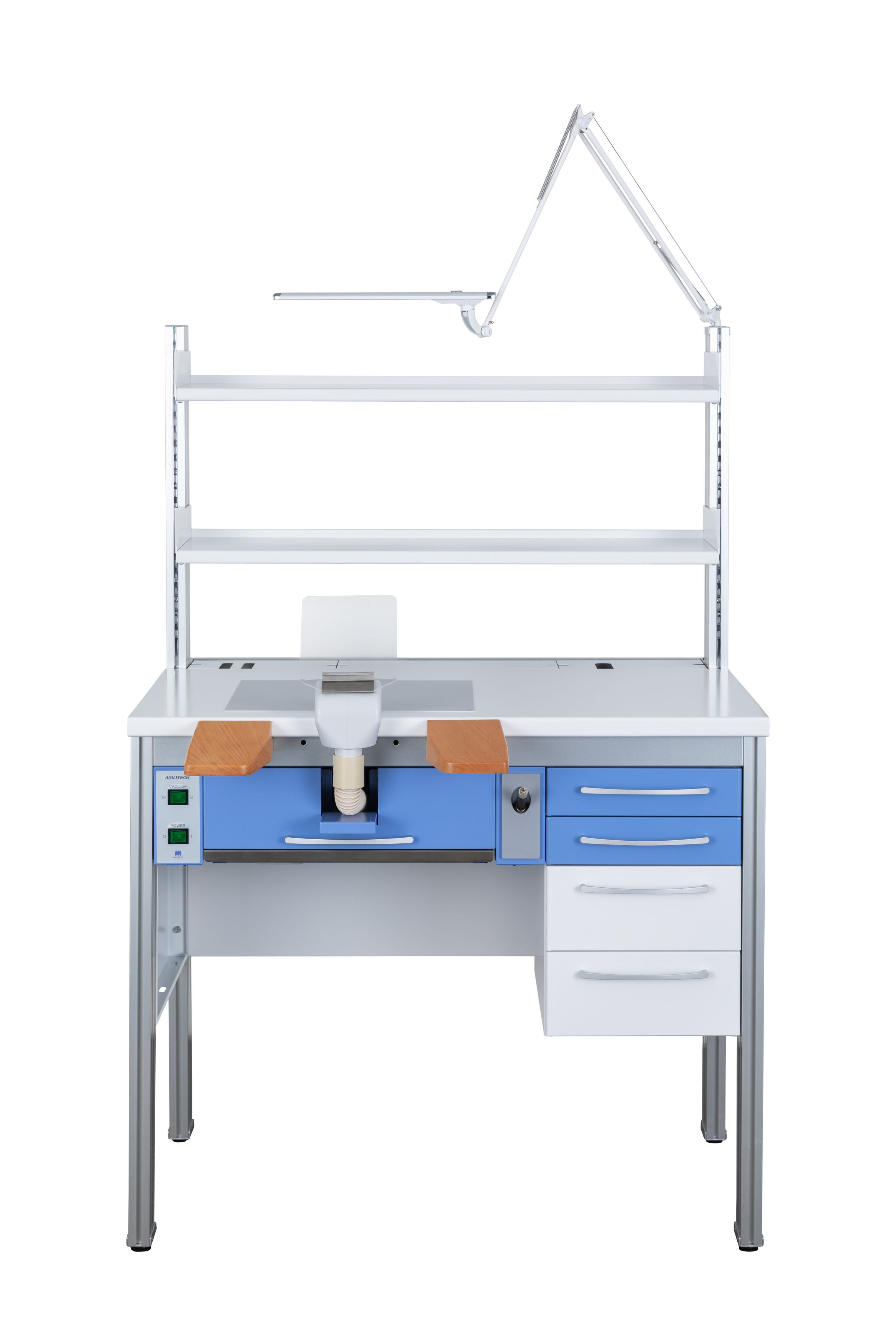 人間工学によりデザインされているため、作業効率を高め、快適空間に導く技工机です。2Wayバキュームマウスは、研磨作業内容に合わせて、吸い込み口を天板上、引き出し中へと移動可能です。