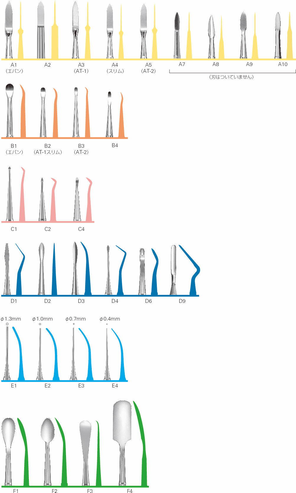 仕様 【先端部規格】A1~A5、A7~A10(刃はついてません)、B1~B4、C1、C2、C4、D1~D4、D6、D9、E1~E4、F1~F4