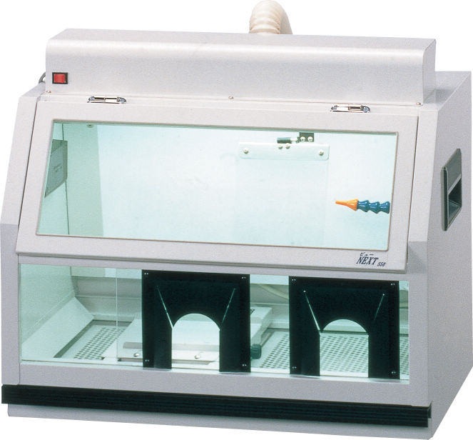 技工用レーズを使用して研磨作業を行う際に発生する多量の粉塵を密閉状態で吸塵し、クリーンなワークスペースを確保できる技工用レーズボックスで、コンパクトな一人用です。バキュームに接続して密閉状態で吸塵するため、粉塵をほとんど外に出さないうえ、音も静かです。また、椅子に掛けて作業ができるため作業姿勢が安定し、照明装置付きのため手元を明るく照らします。電気装置を外部に設置するなど、安全性も考慮されています。