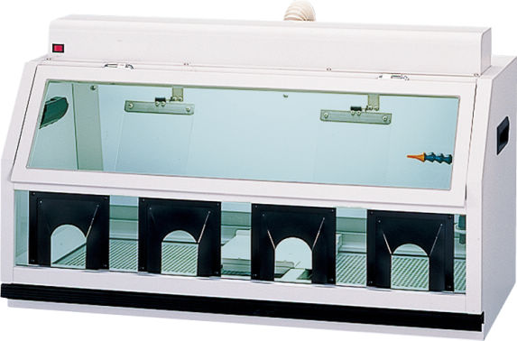 技工用レーズを使用して研磨作業を行う際に発生する多量の粉塵を密閉状態で吸塵し、クリーンなワークスペースを確保できる技工用レーズボックスです。一人用でレーズの左右を使用できる中型タイプです。バキュームに接続して密閉状態で吸塵するため、粉塵をほとんど外に出さないうえ、音も静かです。また、椅子に掛けて作業ができるため作業姿勢が安定し、照明装置付きのため手元を明るく照らします。電気装置を外部に設置するなど、安全性も考慮されています。