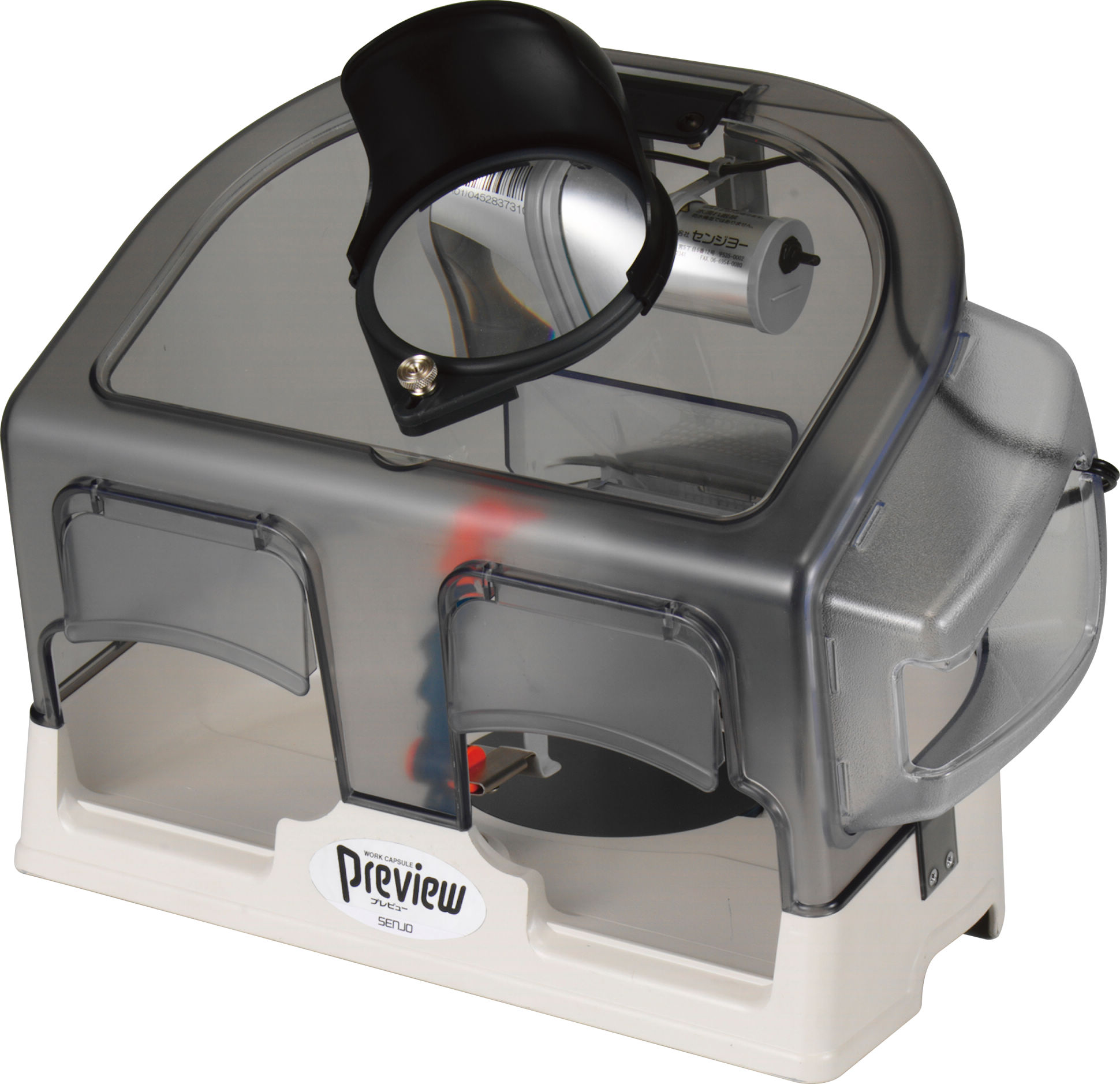エアーによる冷却と吸引が同時にでき、拡大レンズやLEDが付いているため、精密作業時にも威力を発揮します。また、内部が広いため、マイクロモーターの操作性が良く、金属回収用トレーも付いています。