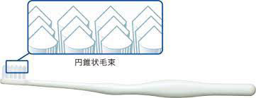 ステインの蓄積しやすい歯間部に届きやすい円錐状毛束で、ネックはステインがつきやすい舌側、口蓋側も磨きやすい内側に3°曲がっています。ペングリップに適したハンドル形状の、ステインオフする歯科用美白歯ブラシです。