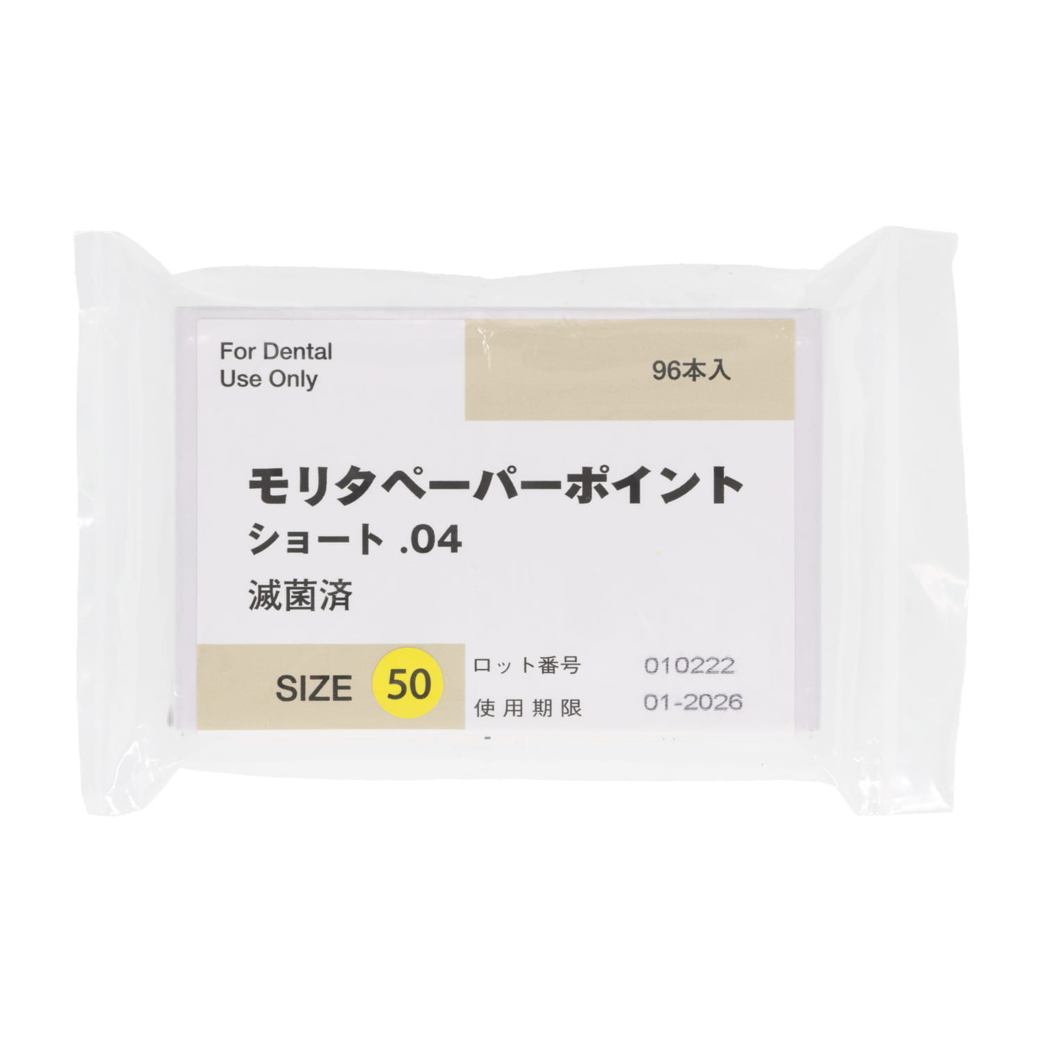 日本人永久歯の平均歯根長に準じた全長12mmとなっており、ISO型(全長28mm)と比較して短いためハサミによる切断が不要です。また、04テーパーとなっておりISO型(02テーパー)と比較して太くなっているため、#30でも腰が強く、根管内への挿入・抜き出しを容易に行うことができます。滅菌済個別包装で、1パック1歯ごとに使用することができます。