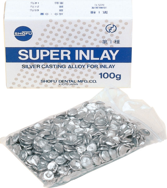 健康保険に指定されている第1種のインレー鋳造用銀合金です。銀65%を含有し、高い縁端強度と少ない変色が特長です。