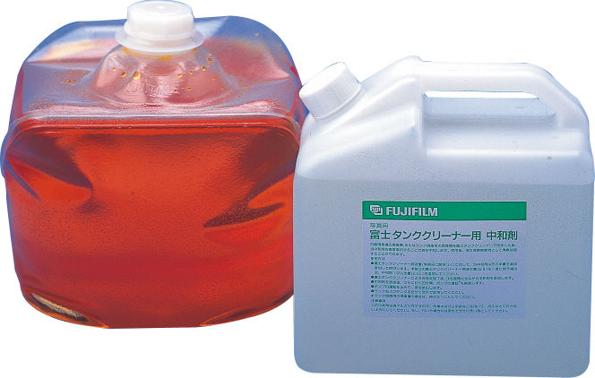 タンククリーナーは原液を約8倍に薄めてローラー等を浸けるだけで、短時間に汚染が消え、後は温水で洗うだけで現像液で汚染された器具がきれいになります。また、中和剤は産業廃棄物として 排液処理ができるよう、使用済みのタンククリーナーを中和するものです。