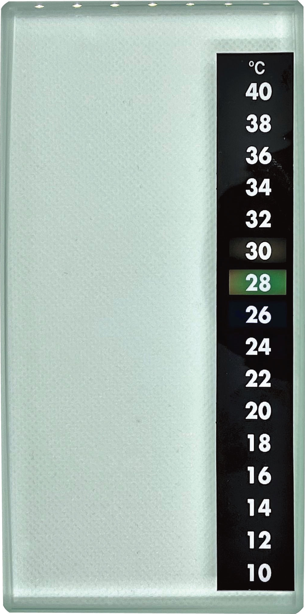 練板の現在温度を数字(緑色)で表示。測定温度は10℃~40℃です。耐熱性、耐水性に優れたサーモラベルで、オートクレーブ滅菌(132℃)に対応しています。