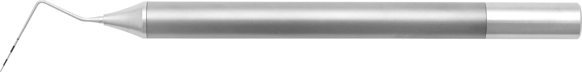 9.5mmの太めのハンドルで安定した施術が可能です。先端径はφ0.45mmと細く、歯周組織への負担を軽減します。また、先端目盛りは、黒酸化皮膜処理によるマーキング刻印で落ちにくく耐久性に優れています。
