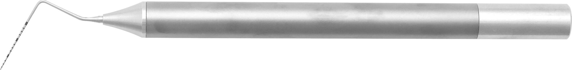 9.5mmの太めのハンドルで安定した施術が可能です。先端径はφ0.45mmと細く、歯周組織への負担を軽減します。また、先端目盛りは、黒酸化皮膜処理によるマーキング刻印で落ちにくく耐久性に優れています。
