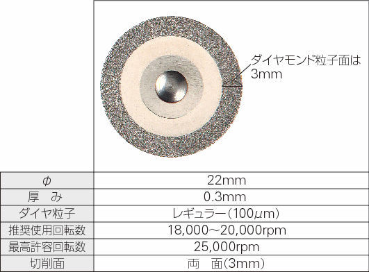 コンポジット、メタル、ポーセレン、ジルコニアに対応し、全てのカット形態修正が可能です。ダイヤモンド粒子が均等に付着している為削り切削粉が溜まらず、メタル切削後ポーセレンに使用しても黒くなりにくくなっています。内部までダイヤモンドが詰っているので高い切削力と耐久性があり、発熱しにくいのでジルコニアの形態修正にも適しています。