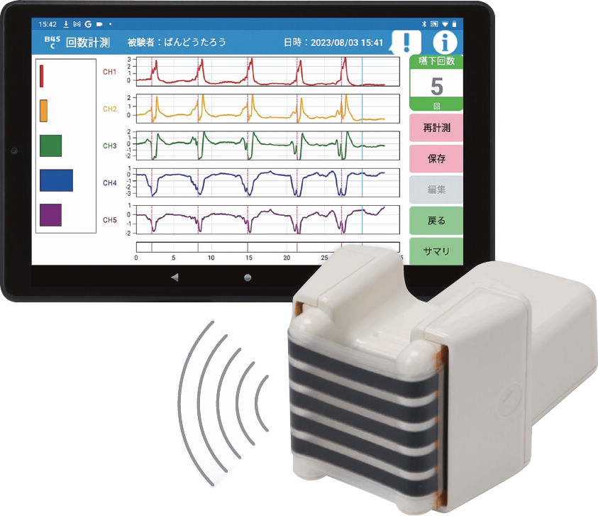 30秒間の嚥下回数と嚥下間隔(嚥下タイミング)を測定、「数値化」「記録」します。