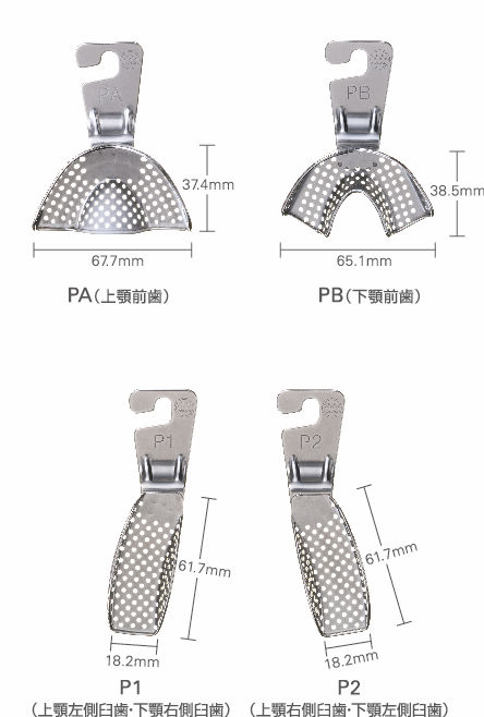 耐食性・耐久性に優れたステンレススチール製の印象トレーです。従来製品よりも軽量で、収納・管理に便利なフックタイプのハンドル形状となっています。