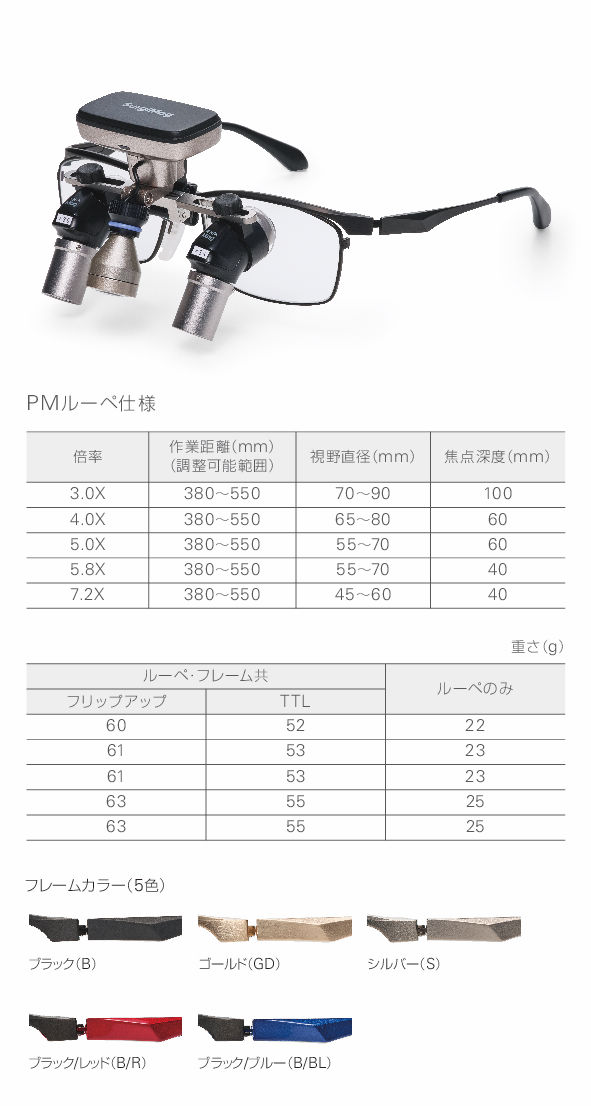 | 仕様 | 【仕様】 - ルーペ倍率:5種(3.0倍、4.0倍、5.0倍、5.8倍、7.2倍) - フレームカラー:5種 ブラック(B)、ゴールド(GD)、シルバー(S)、ブラック/レッド(B/R)、ブラック/ブルー(B/BL) |