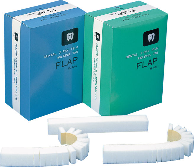 口内X線撮影用のフィルムを保持する咬合ピースです。発泡ポリエチレンを使用し、ディスポーザブルで衛生的です。粘着部をフィルム面に付け、患者に咬合させるので術者のX線障害防止に役立ちます。薄型FL-500は、咬翼撮影にも適しています。