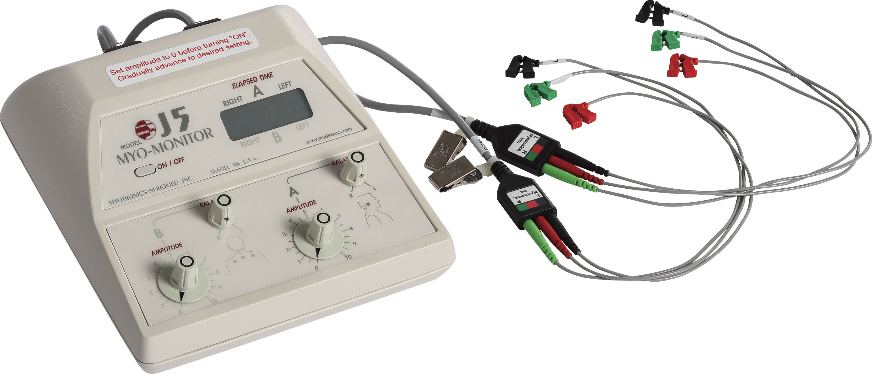 マイオモニターJ5は超低周波治療器のTENS装置です。咀嚼筋と頚部の2ヶ所の筋肉を同時に刺激することができ、治療に要する時間が短縮され負担も軽減されます。