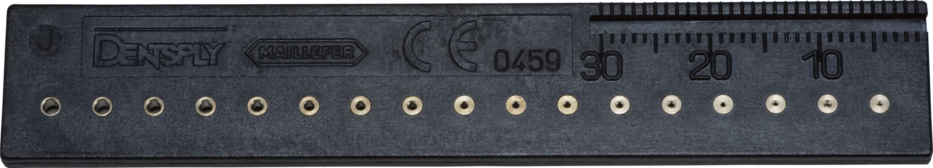 シルバーポイントやガッタパーチャポイントは、製造工程(手加工等)の関係上、尖端がどうしても不揃いになります。そのため、マスターポイントとして根尖封鎖をする前に、形成したアピカルシートにぴったりと適合させるため、エンドゲージの表側より差し込み、適当なナイフでエンドゲージの裏面にそって尖端をカットします。
